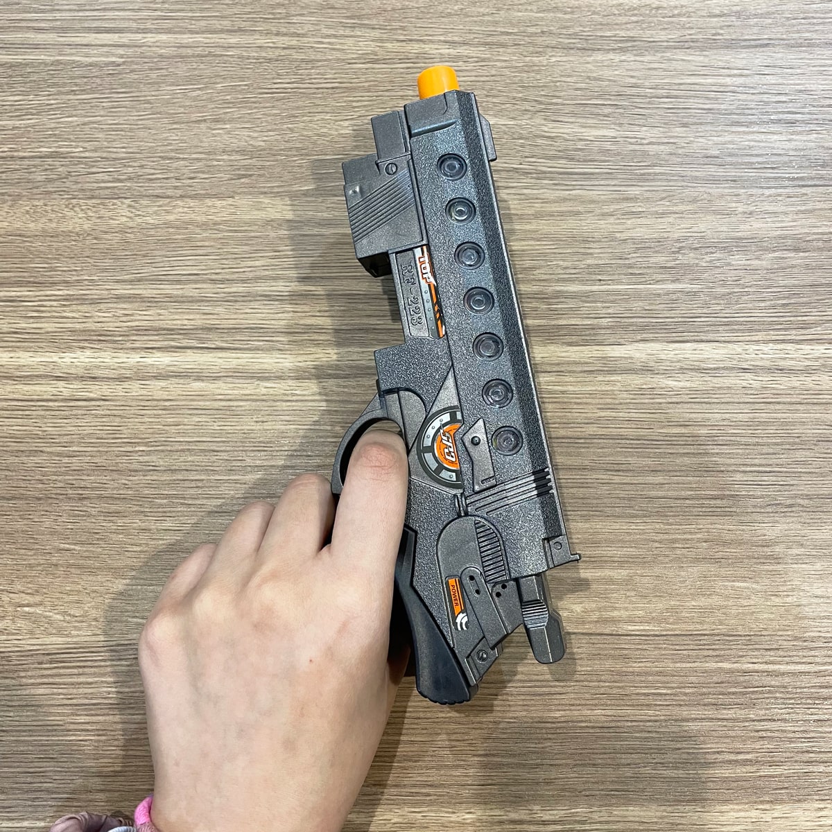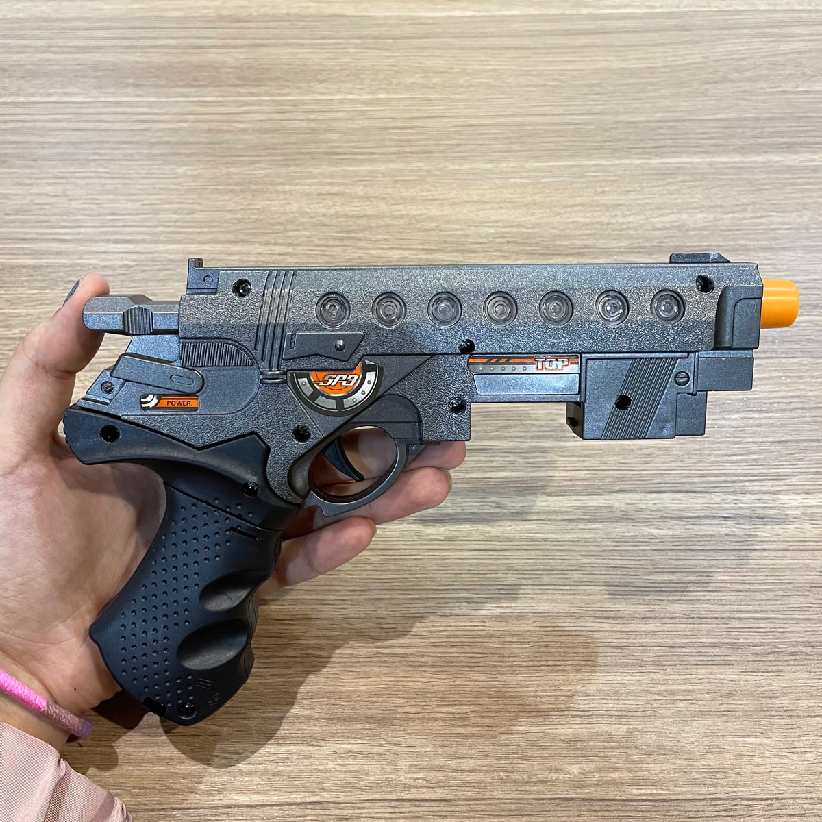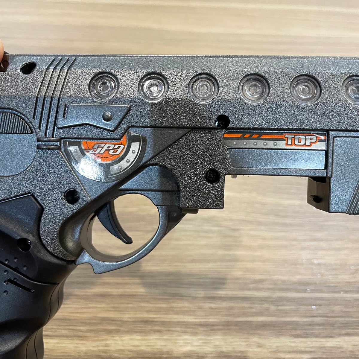 با قرار دارد دو عدد باتری قلمی در این اسباب بازی و فشردن ماشه، خواهید دید که با نورافشانی و پخش موزیک کودک را مجذوب خود میکند. بخش خشاب به زیبایی طراحی شده که دارای قابلیت چرخش تیر و نورپردازی بوده و کودک را ساعتها سرگرم میکند.