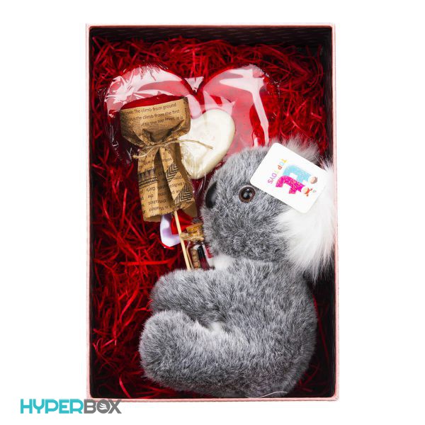 کوالا، از آن دسته حیوانات بانمک و دوستداشتنی است که شما به سختی میتوانید فردی را پیدا کنید که با دیدن این کوچولوهای خوابالو که روزانه حدود ۲۲ ساعت میخوابند لبخند نزند! همانطور که میدانید این حیوان قابل نگهداری در خانه نیست و برای همین علاقهمندان به آن فرصت نوازش و یا دیدن حیوان موردعلاقهشان از نزدیک را به ندرت کسب خواهند کرد. سایز این عروسک کوالا حدود ۲۰ سانتیمتر است و به خاطر شباهت زیادش به نمونهی واقعی، فوقالعاده دوستداشتنی و پرطرفدار است. دستهای این کوالای بانمک، درست به فرم و حالتی که دستهای کوالای واقعی همیشه به دور شاخهی درخت پیچیده شده، حلقه شدهاند و شما میتوانید آنها را دور دستتان قرار دهید تا روی دست شما هم مثل اکثر مواقع استراحت کنند و بخوابند. وجود همچین عروسکی در این باکس، آن را فوقالعاده غافلگیرکننده و متفاوت کرده است. هنگامی که در باکس را باز کنید، میبینید که کوالای کوچک شما یک آبنبات چوبی قلبی و بزرگ، یک گل رز قرمز مصنوعی و نمدی و یک شیشهی آرزوها را را در دستانش نگه داشته وهمهی آنها را با عشق به کسی که در جعبه را باز کرده است تقدیم میکند.